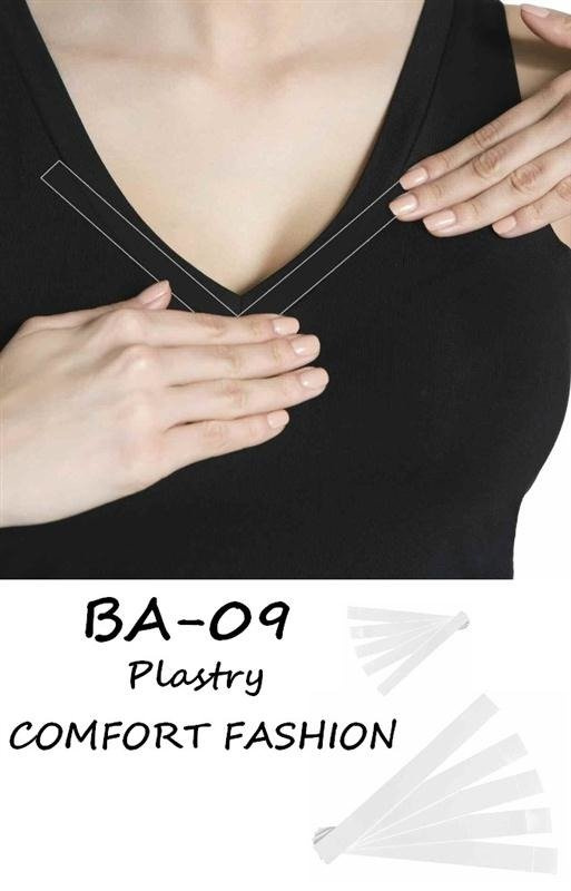 - Plastry Julimex BA 09 Dwustronne Plastry Comfort Fashion - ułatwiają stylizację bluzek oraz sukni z głębokim dekoltem. Z jednej strony przykleja się je do ciała, z drugiej strony do wewnętrznej strony ubrania. Zapewniają dzięki temu duży komfort noszenia