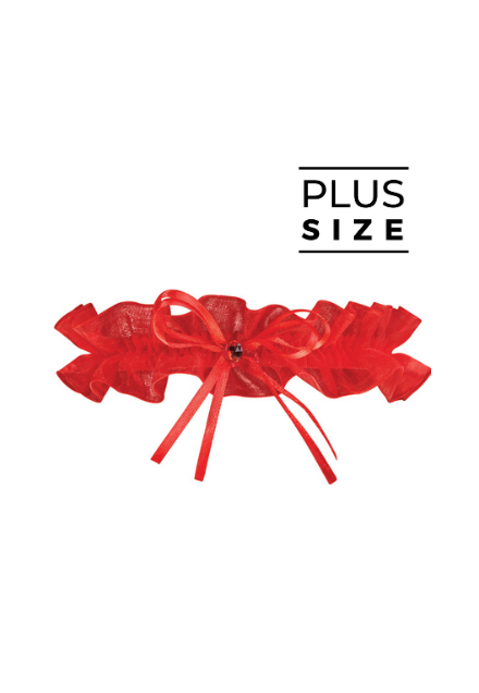 Czerwona, przyciągająca wzrok podwiązka z delikatnej warstwy marszczonego tiulu. Jej środek zdobi subtelna kokardka ton w ton i kryształowe oczko. Aby zapobiec zsuwaniu, podwiązke zaopatrzono w warstwę silikonu. Podwiązka ma rozmiar plus size - szerokość na nodze 46-70 cm.