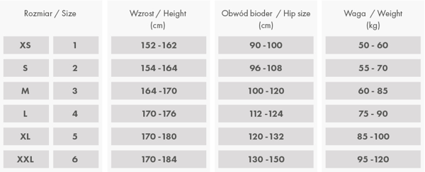 | Rozmiar | Wzrost | Obwód bioder | Waga |
