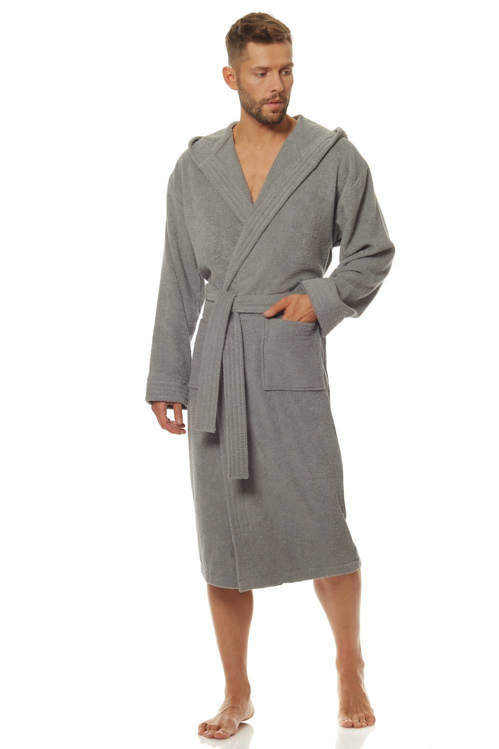 Szlafrok męski L&L 2104_LONG wyróżnia się gładkim fasonem oraz praktycznym wiązaniem, które pozwala na łatwe dopasowanie do sylwetki. Dodatkowym atutem jest kaptur, który nie tylko dodaje szlafrokowi nowoczesnego wyglądu, ale także chroni przed chłodem. Jego długość sprawia, że cała figura mężczyzny jest doskonale osłonięta, co zapewnia jeszcze większy komfort podczas relaksu w domowym spa lub po gorącej kąpieli.