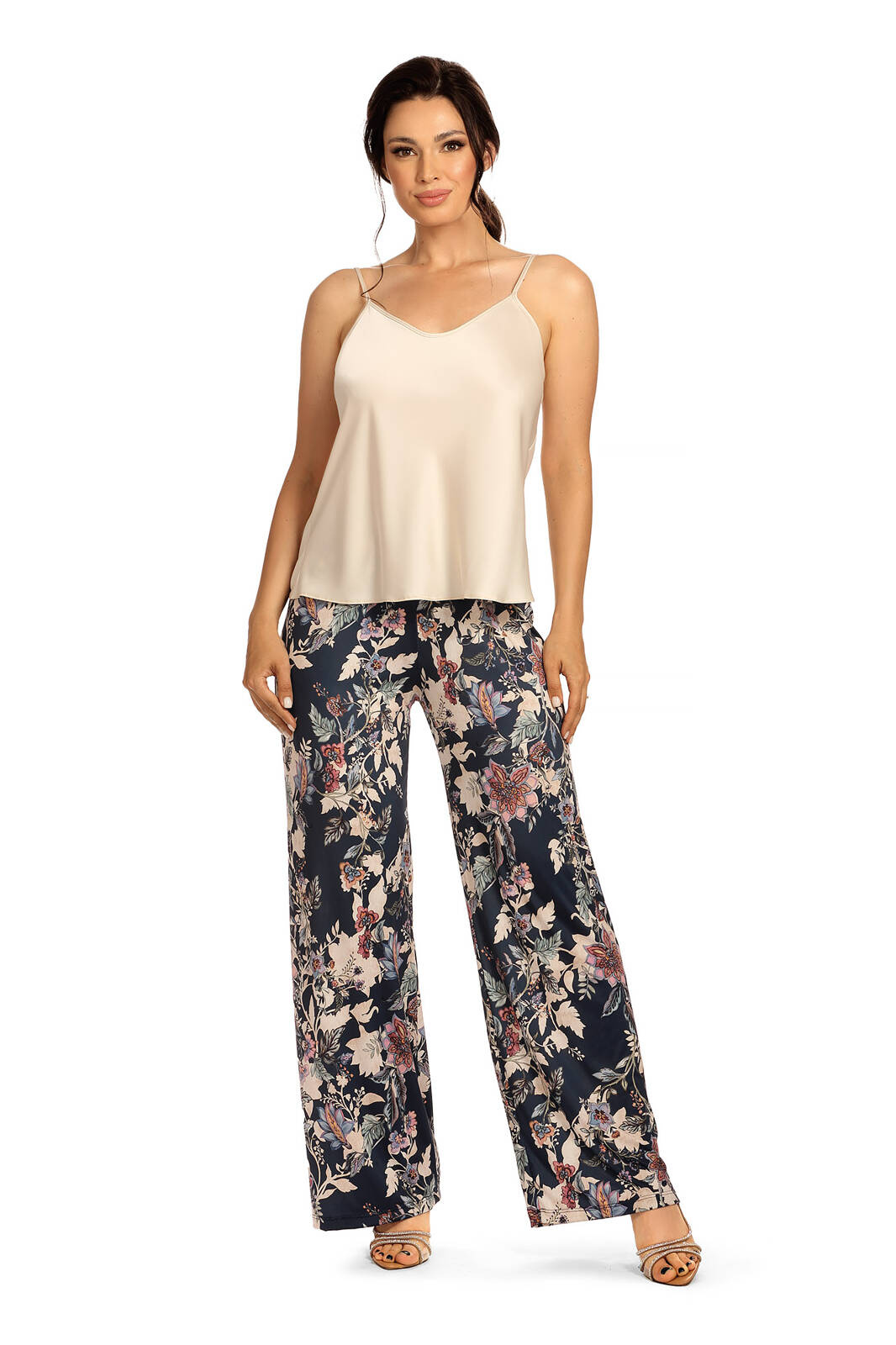 - Satynowe luźne długie spodnie z wzorzystej satyny.