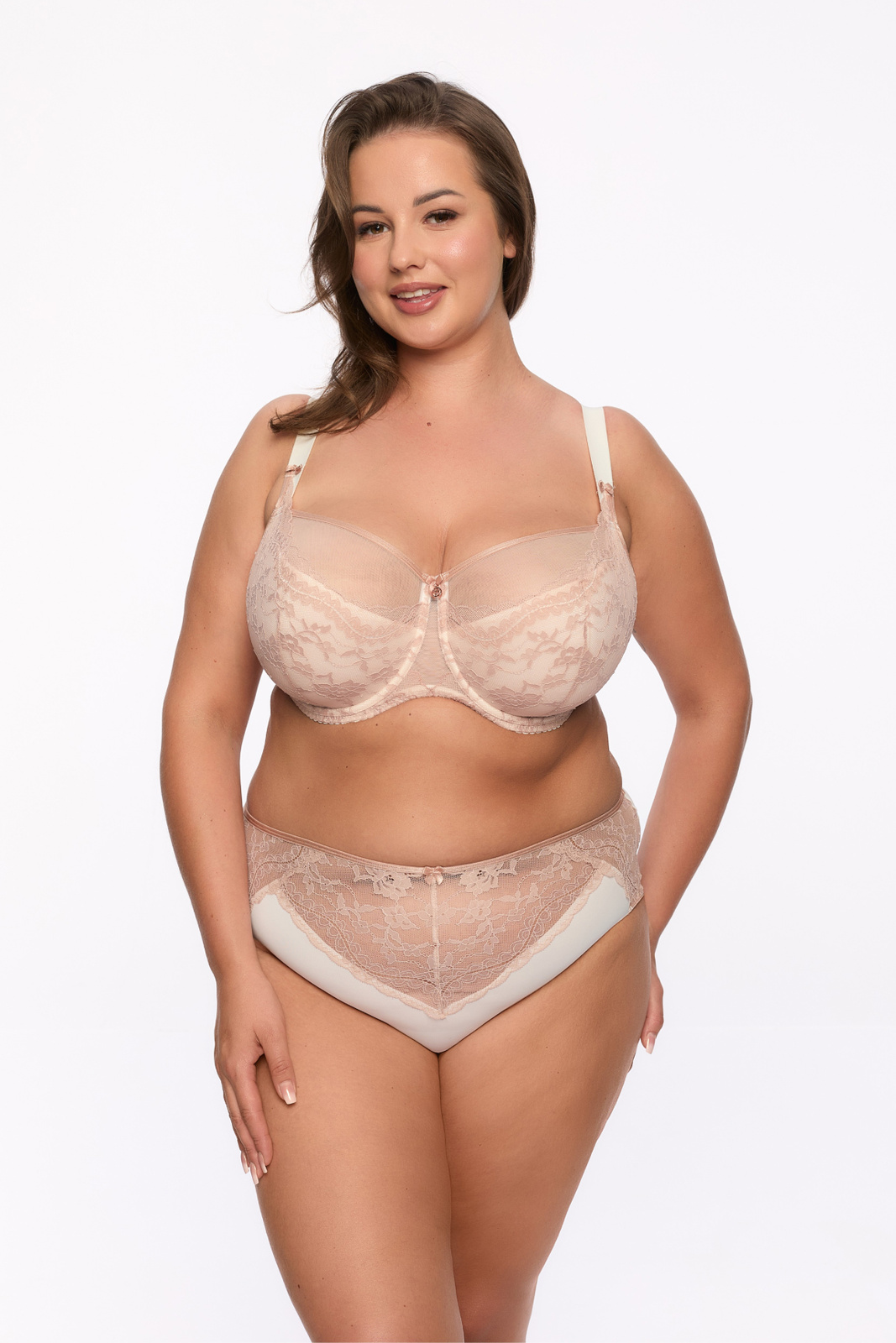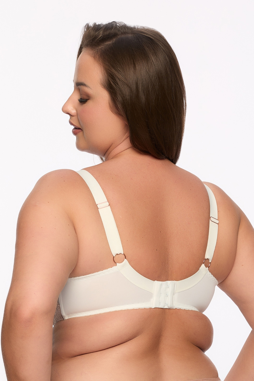 - Półusztywniany biustonosz marki Gaia. Posiada grube odciążające, nieodpinane ramiączka, wykończone koronką. Miski wyścielone są delikatnym tiulem oraz elegancką drobną koronką. Idealny wybór dla kobiet z dużym biustem.