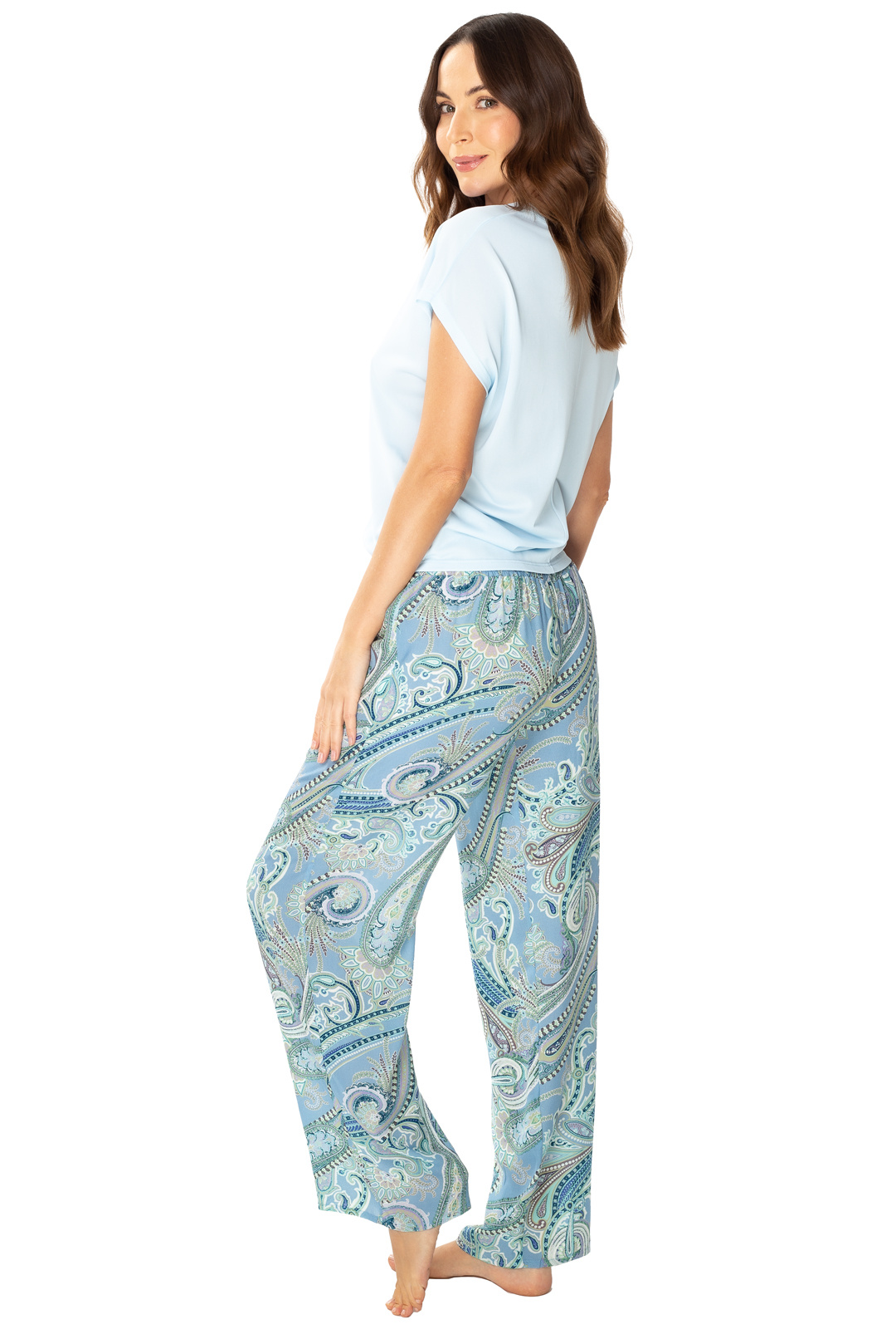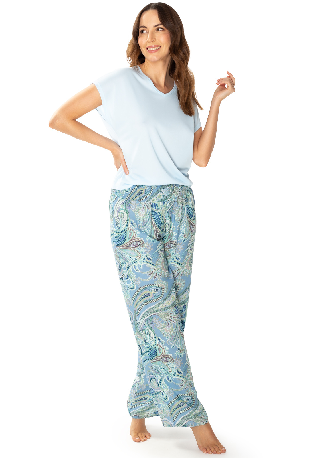 - Niebieska piżamka damska na krótki rękaw. Spodnie długie z motywem abstrakcji.