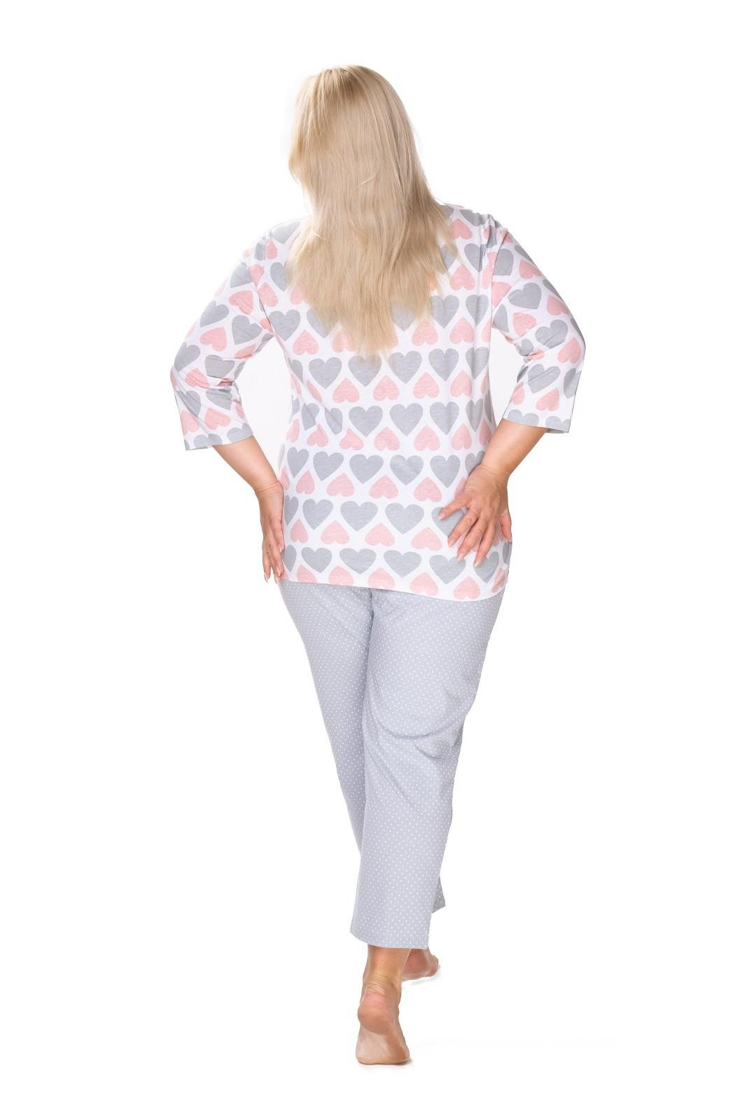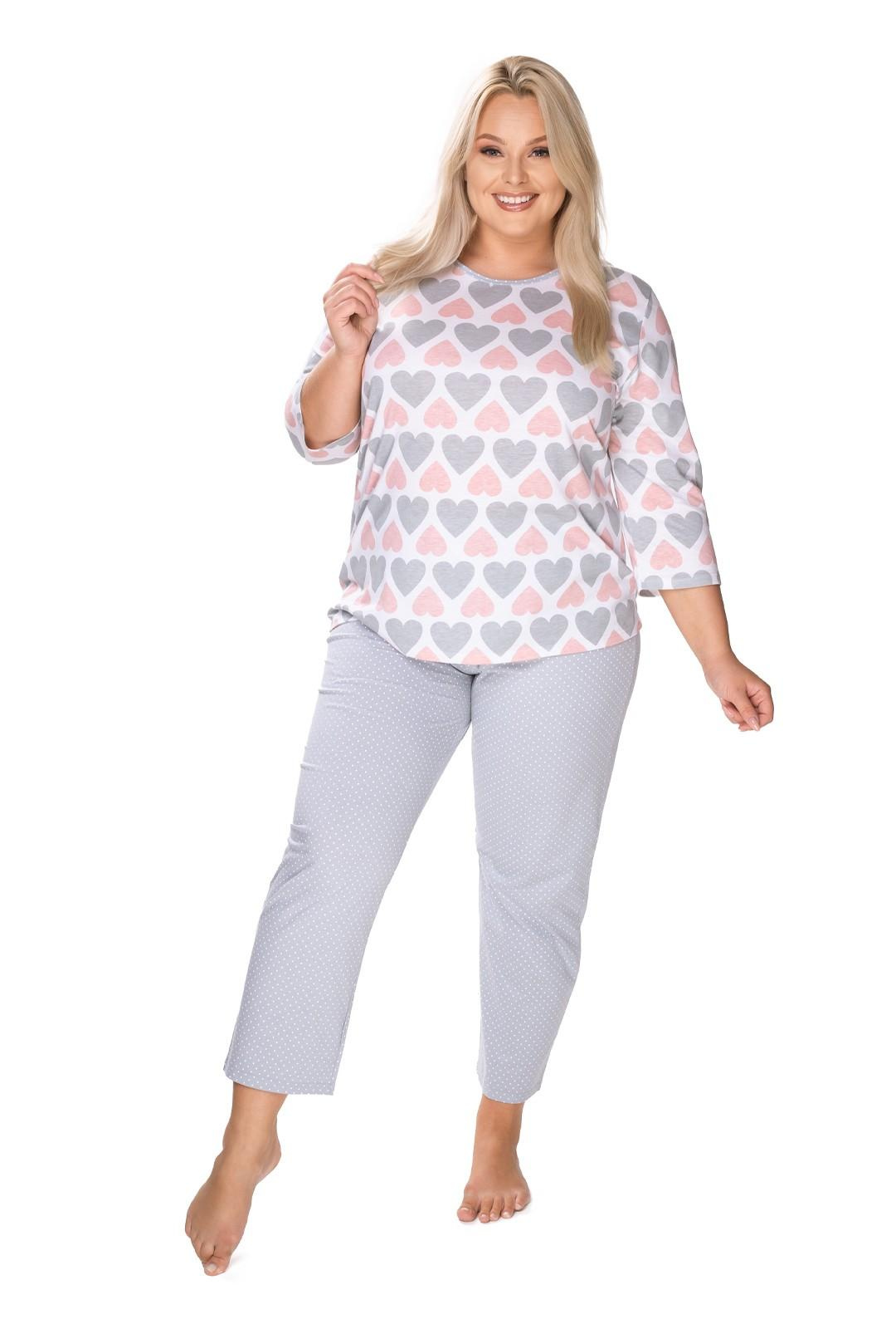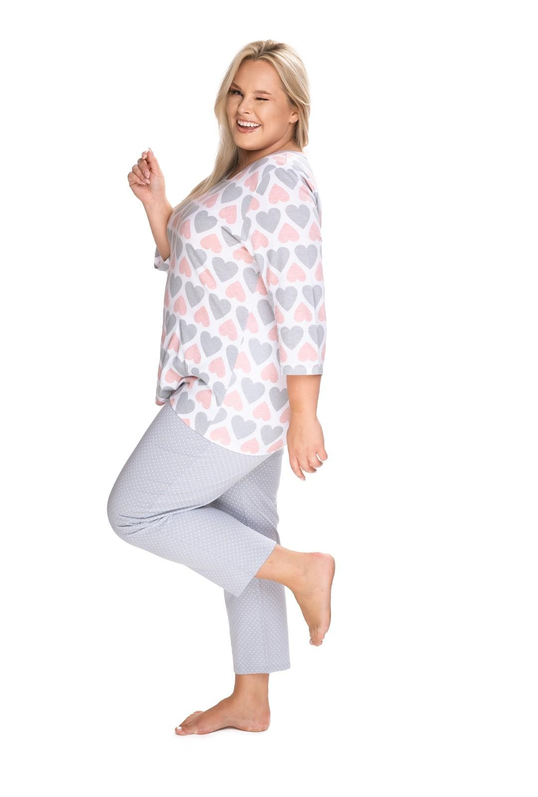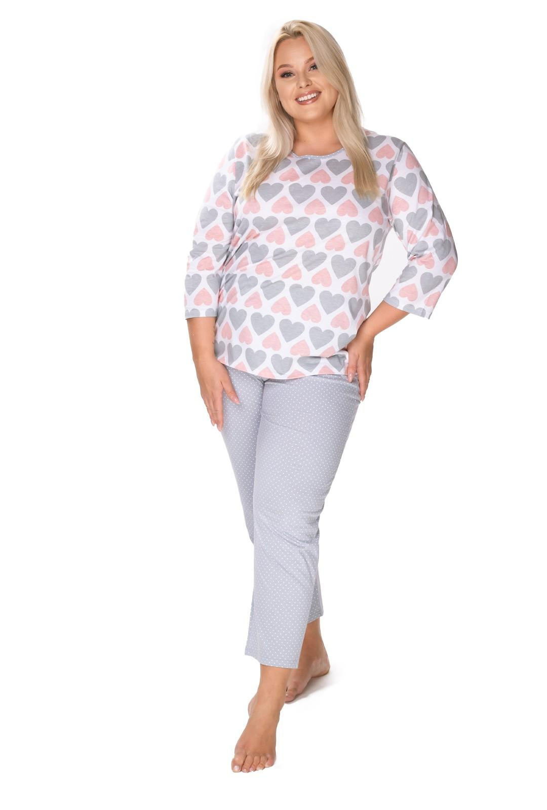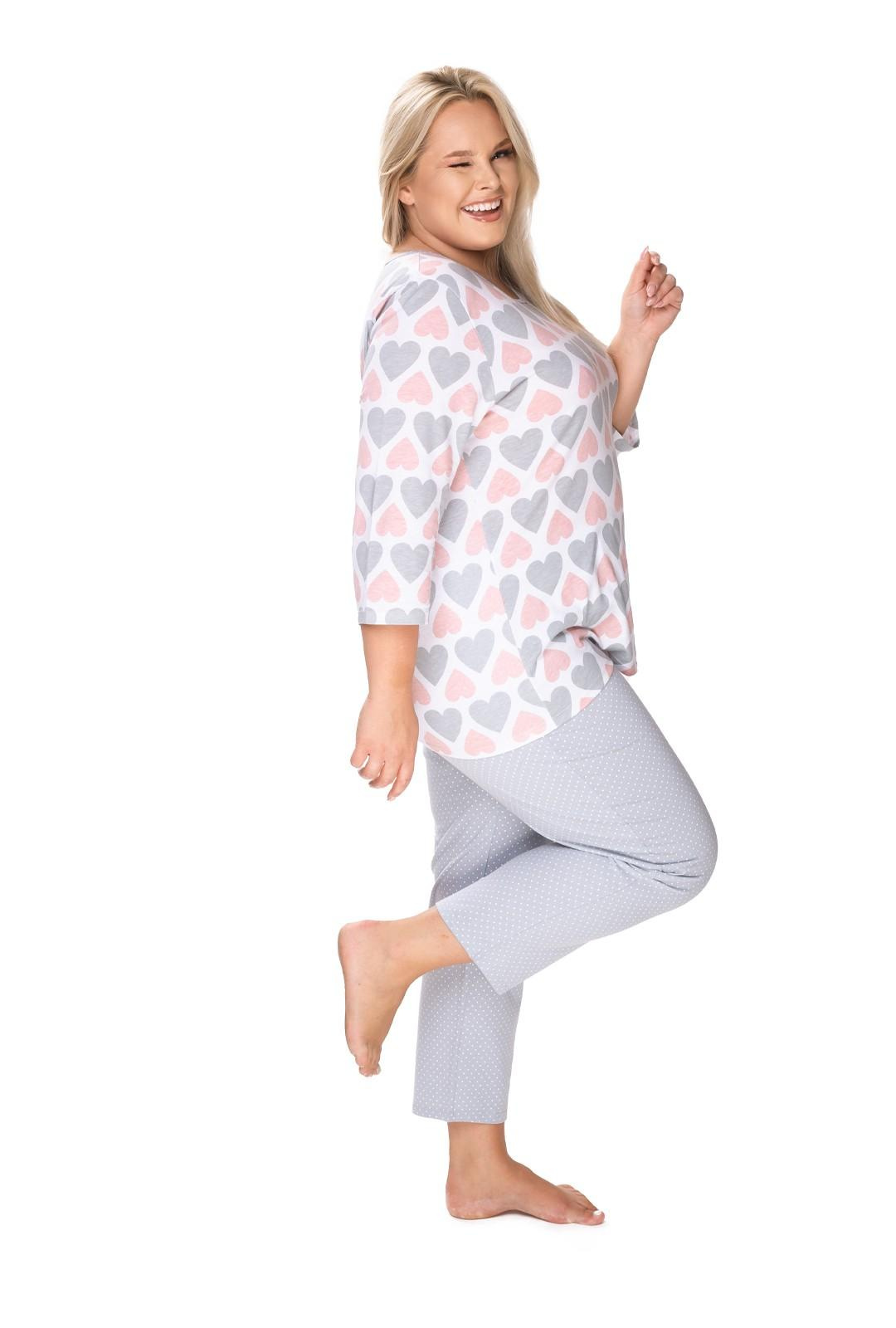 - Wygodna,dwuczęściowa piżama damska w bardzo kobiecej stylizacji w serduszka i kropki. Piżama z koszulką z rękawkiem 7/8 i ze spodniami do łydki.