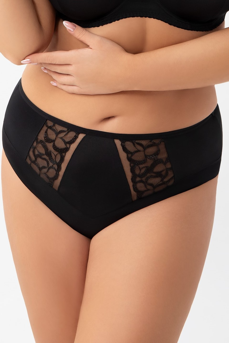- Zjawiskowe figi z wyższym stanem. Zabudowany fason zasłaniający prawie całe pośladki. Wykonane z kryjącej microfibry z haftem na tiulu stabilnym. Tył wykończony poprzez podwinięcie krawędzi microfibry na płasko. Bawełniany kroczek.