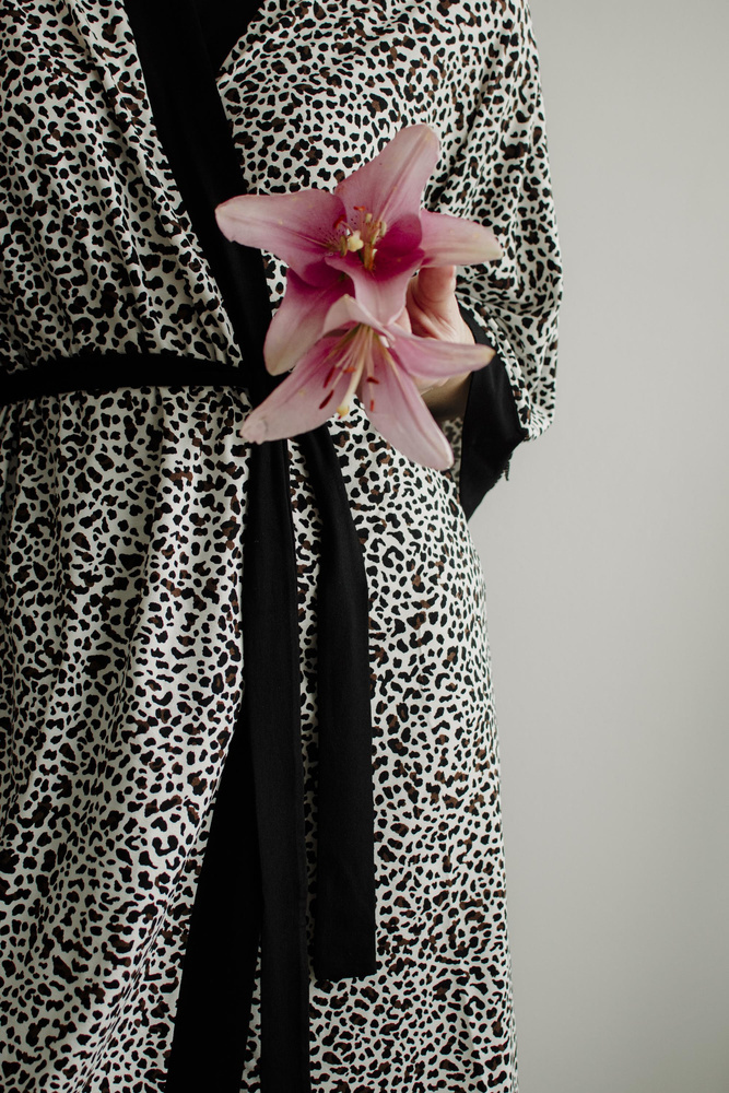 • Elegancki szlafrok z praktycznym wiązaniem w pasie. Modny i ponadczasowy wzór w panterkę. Rękaw 7/8, długość za kolano