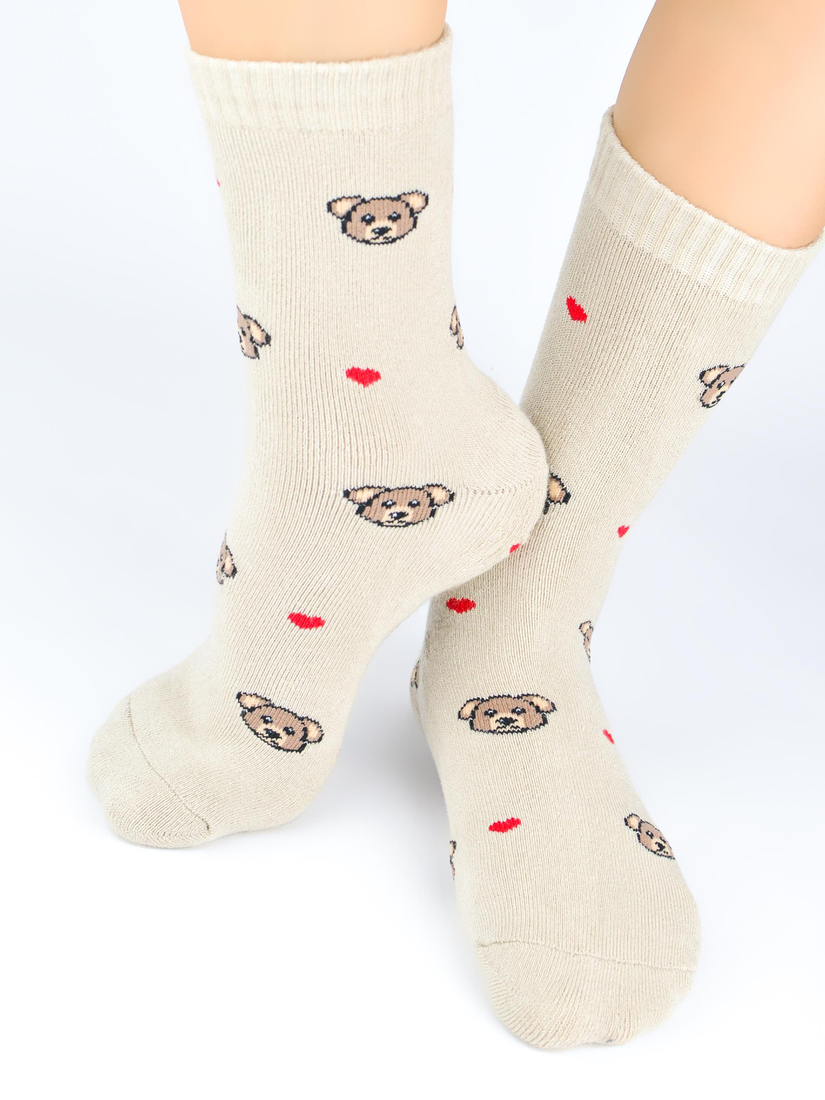 Beżowe skarpetki damskie frotte z misiem SF029grube sploty sprawiają, że doskonale sprawdzą się w chłodniejsze dni, ogrzewając stopy i dbając o ich zdrowie.