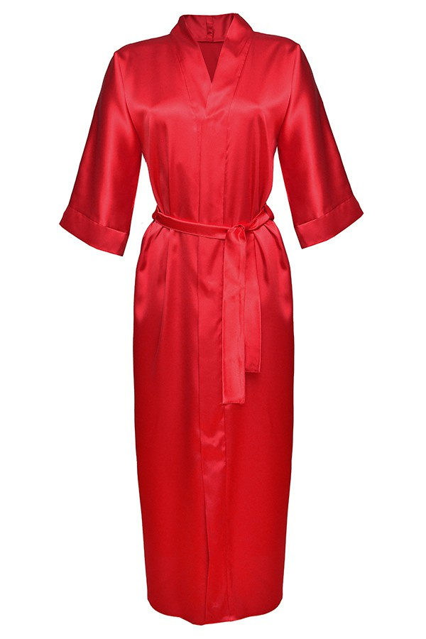 - Elegancka satynowa podomka, wiązana w pasie satynowym paskiem. Rękawki kimonowe, długość do łydki.