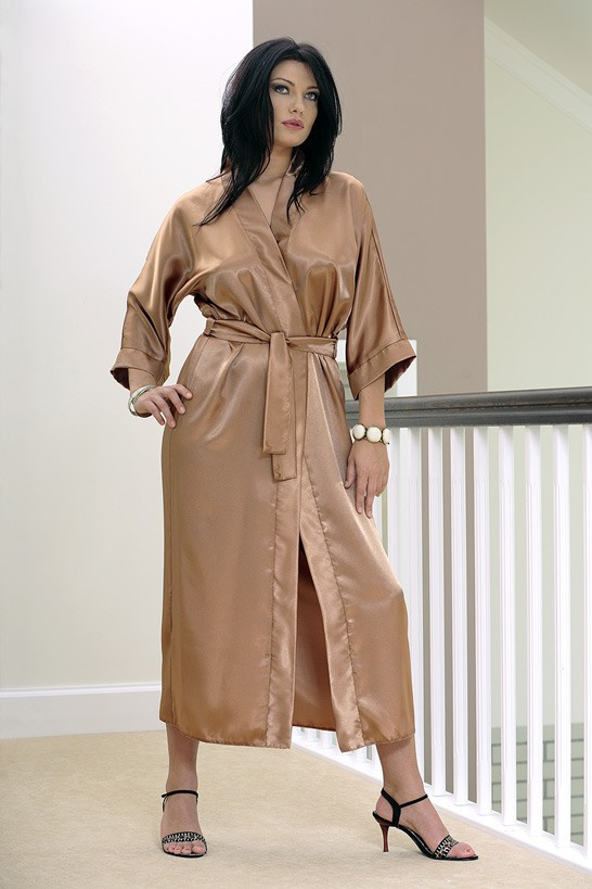 - Elegancka satynowa podomka, wiązana w pasie satynowym paskiem. Rękawki kimonowe, długość do łydki.