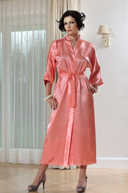 - Elegancka satynowa podomka, wiązana w pasie satynowym paskiem. Rękawki kimonowe, długość do łydki.