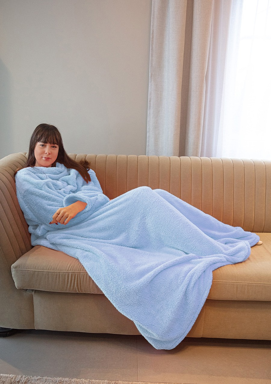 - Bardzo przyjemny w dotyku, puszysty, kocyk z rękawami od marki Dkaren. Z kieszonką z przodu.