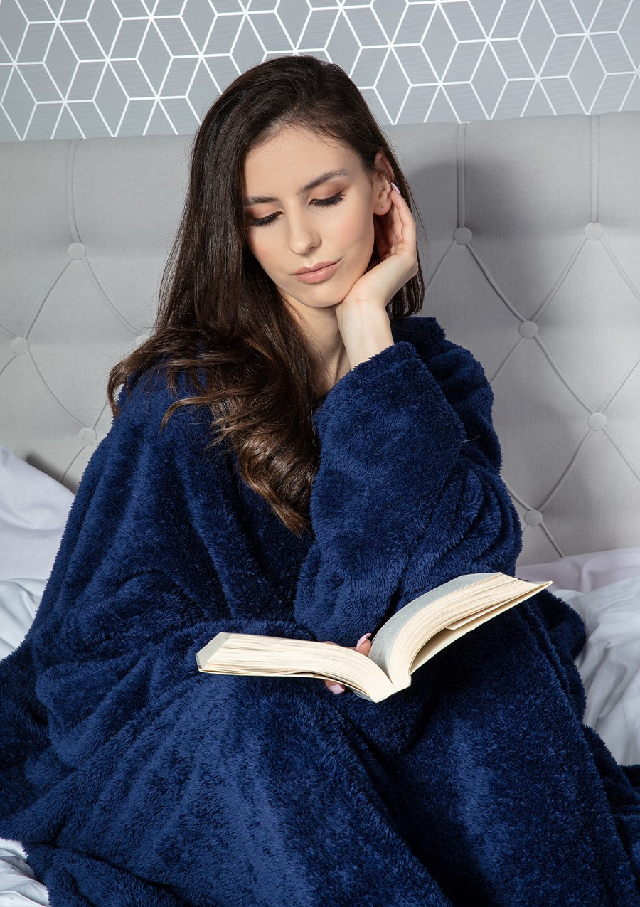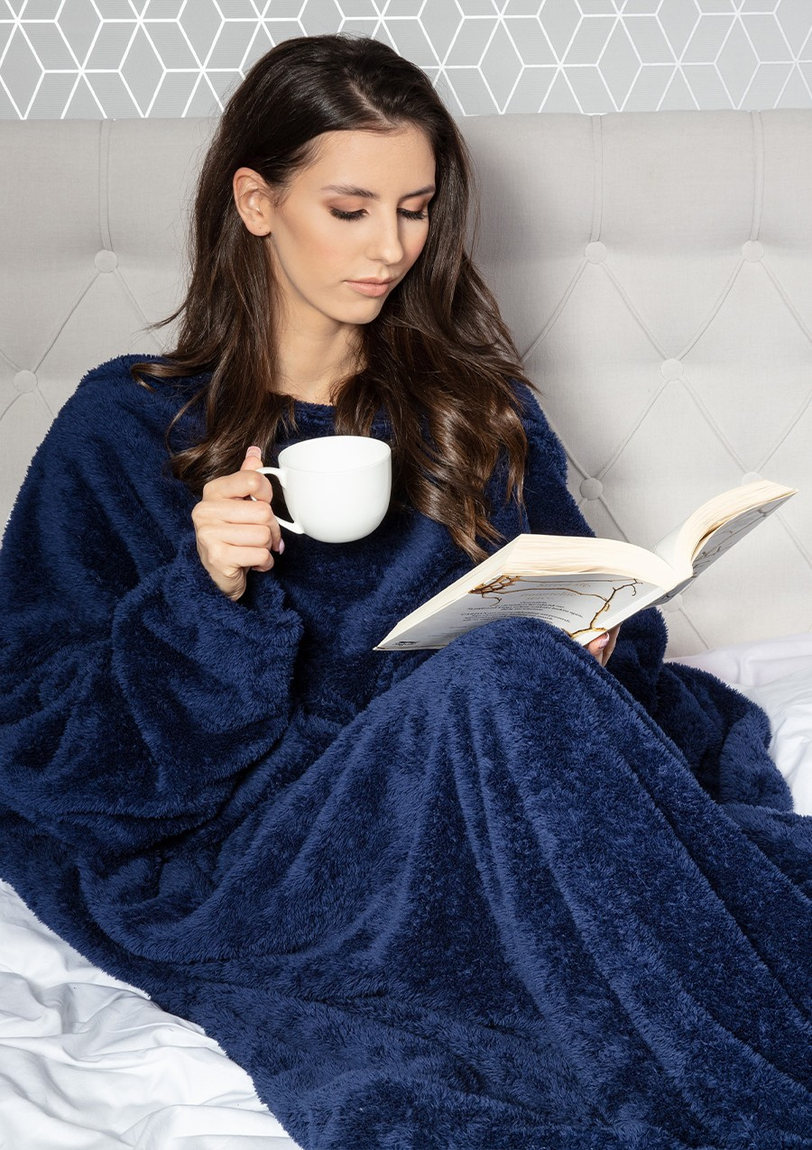 Koc z rękawami - Puch Granat to doskonały wybór dla kobiet, które pragną połączyć elegancję z wygodą. Wybierz nasz produkt i przekonaj się, że relaks w domowym zaciszu może być pełen stylu i komfortu!