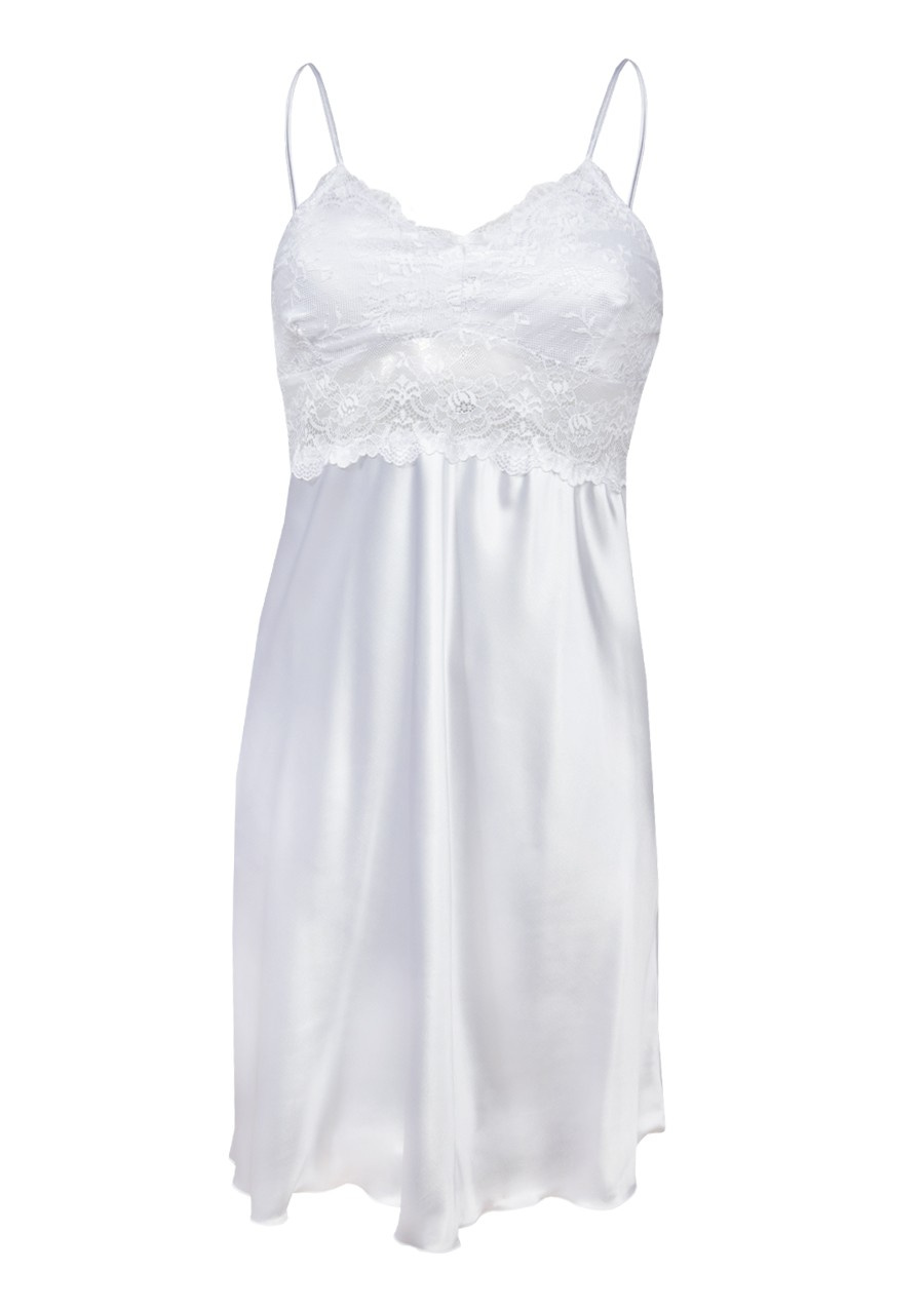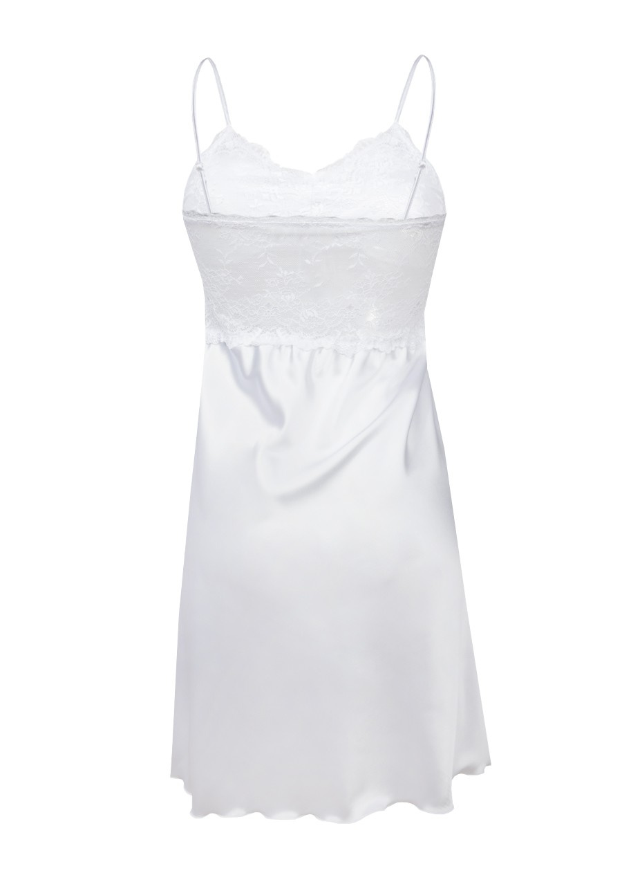 - Delikatna, lejąca haleczka z wysokogatunkowej satyny na ramiączkach, wykończona koronką.