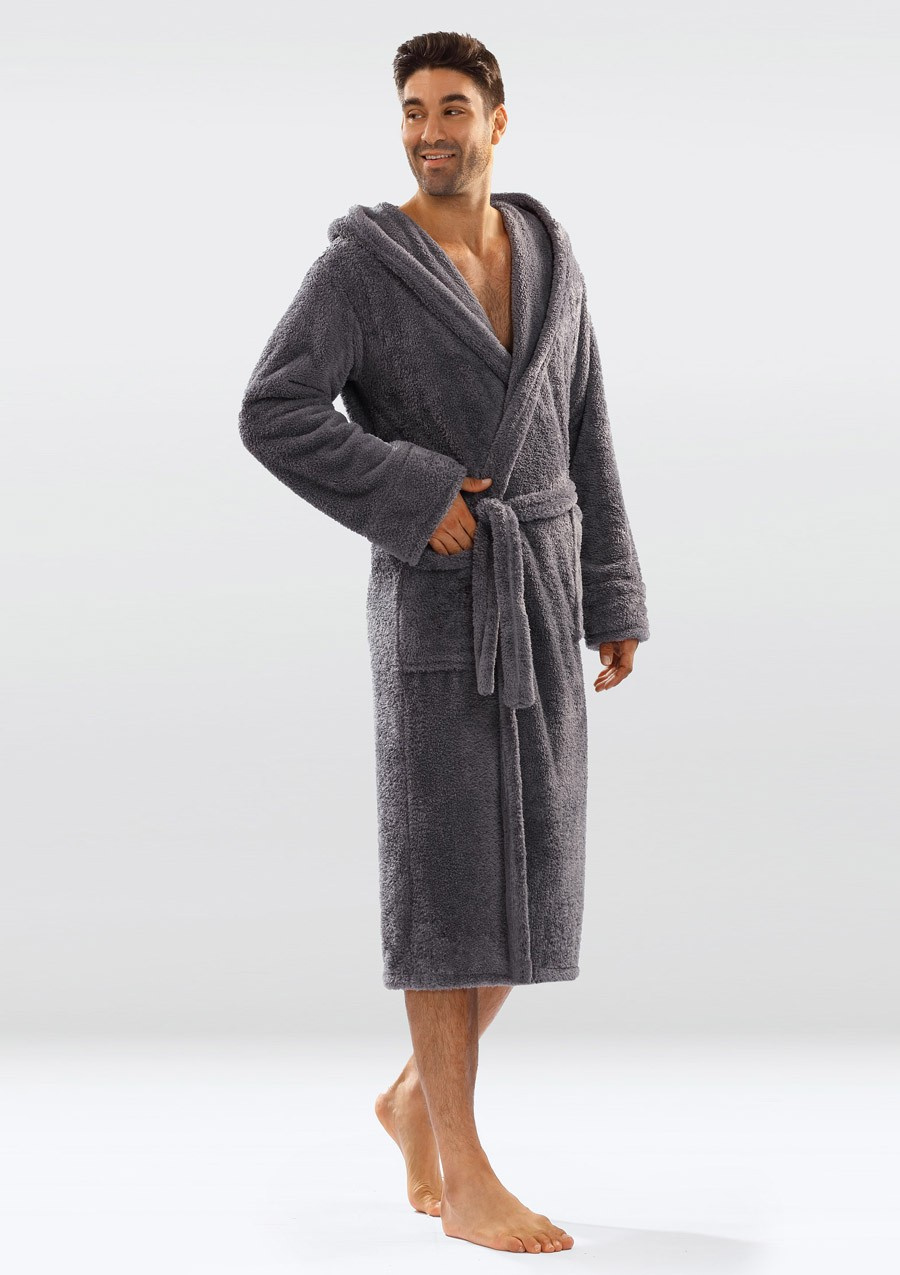 - Elegancki design: Gładka struktura szlafroka w kolorze „puch szary” sprawia, że wygląda on elegancko i stylowo, pasując do każdej męskiej garderoby.