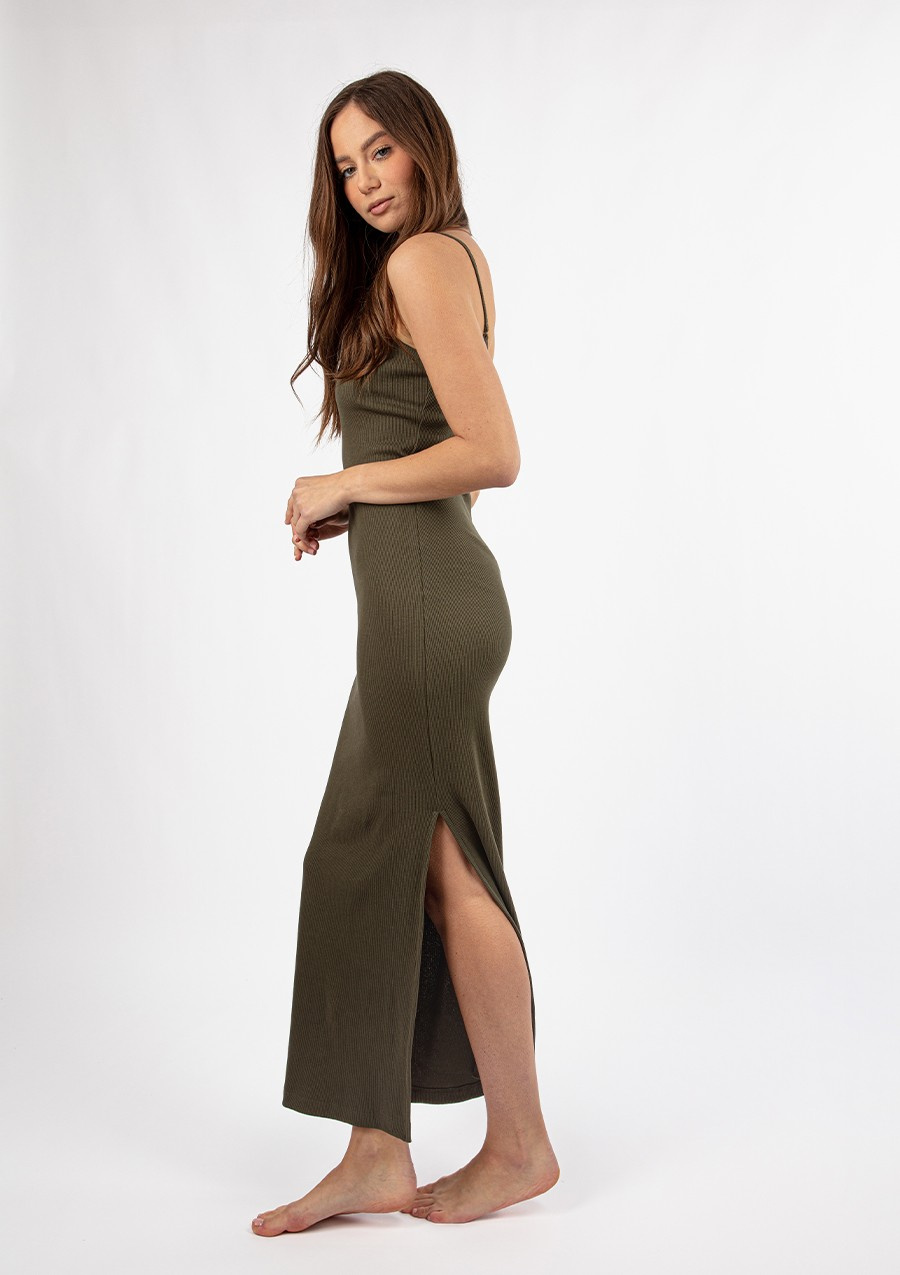 • Prosta sukienka, w kroju maxi od Dkaren ze zmysłowym rozcięciem na prawej nodze. Wysokiej jakości bawełna/prążek.