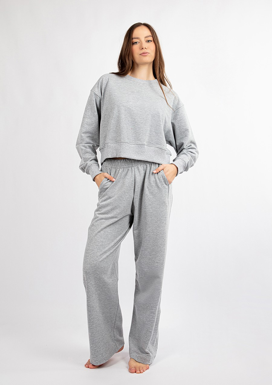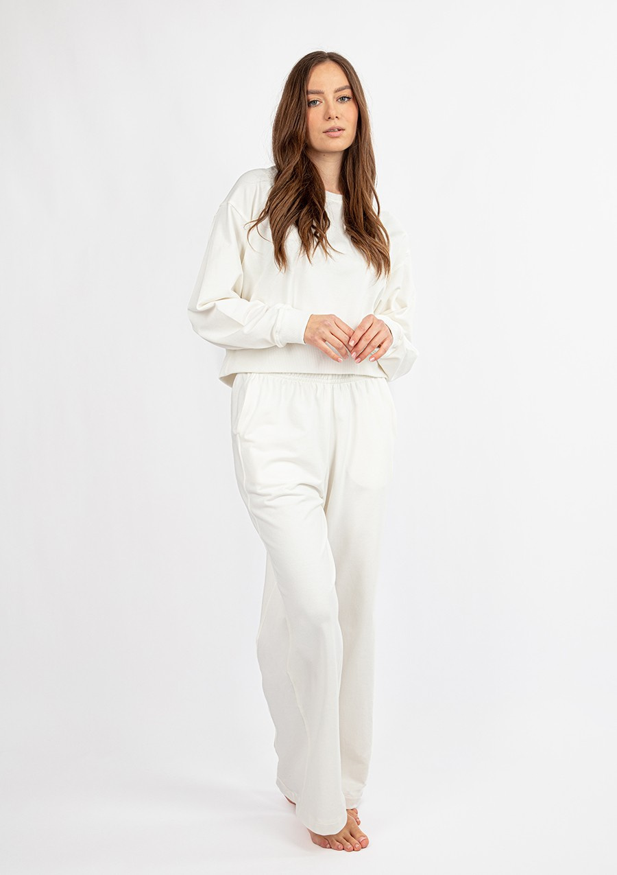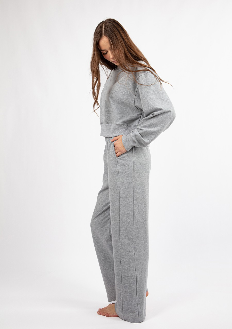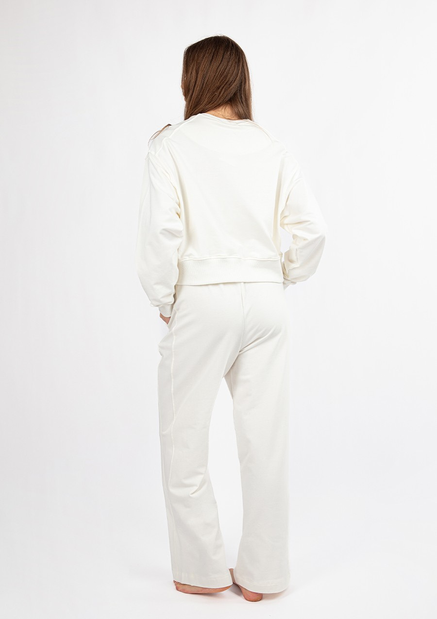 Komplet składa się z długich spodni oraz bluzy z długim rękawem, co sprawia, że idealnie nadaje się na każdą porę roku. 95% bawełny oraz 5% elastanu gwarantuje doskonałe dopasowanie do sylwetki, a także komfort noszenia przez cały dzień. Materiał jest cienki, ale jednocześnie wytrzymały, co zapewnia przyjemność noszenia, nawet w ruchu. Gładka struktura materiału ułatwia pielęgnację i sprawia, że dres wygląda jak nowy nawet po wielu praniach.