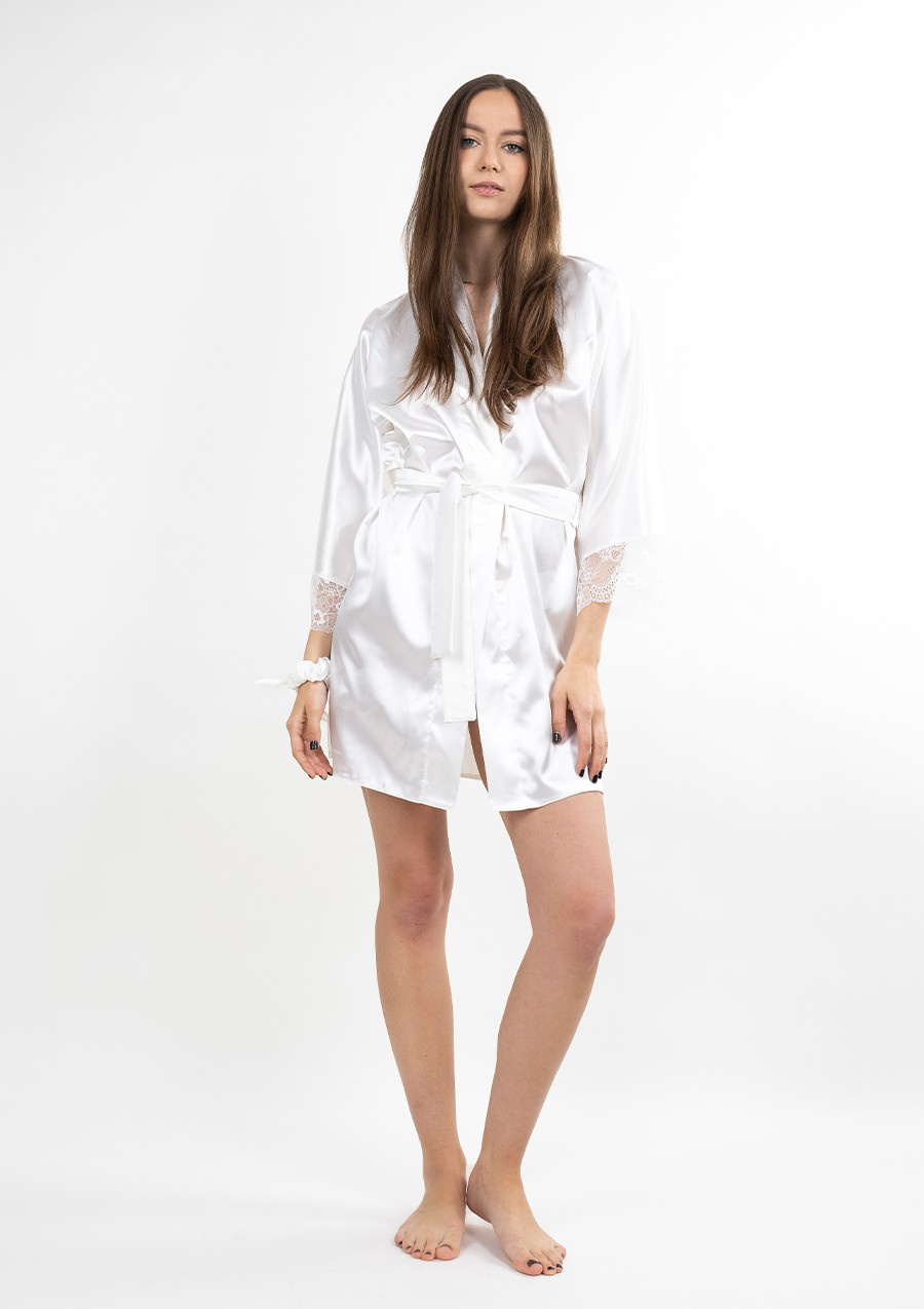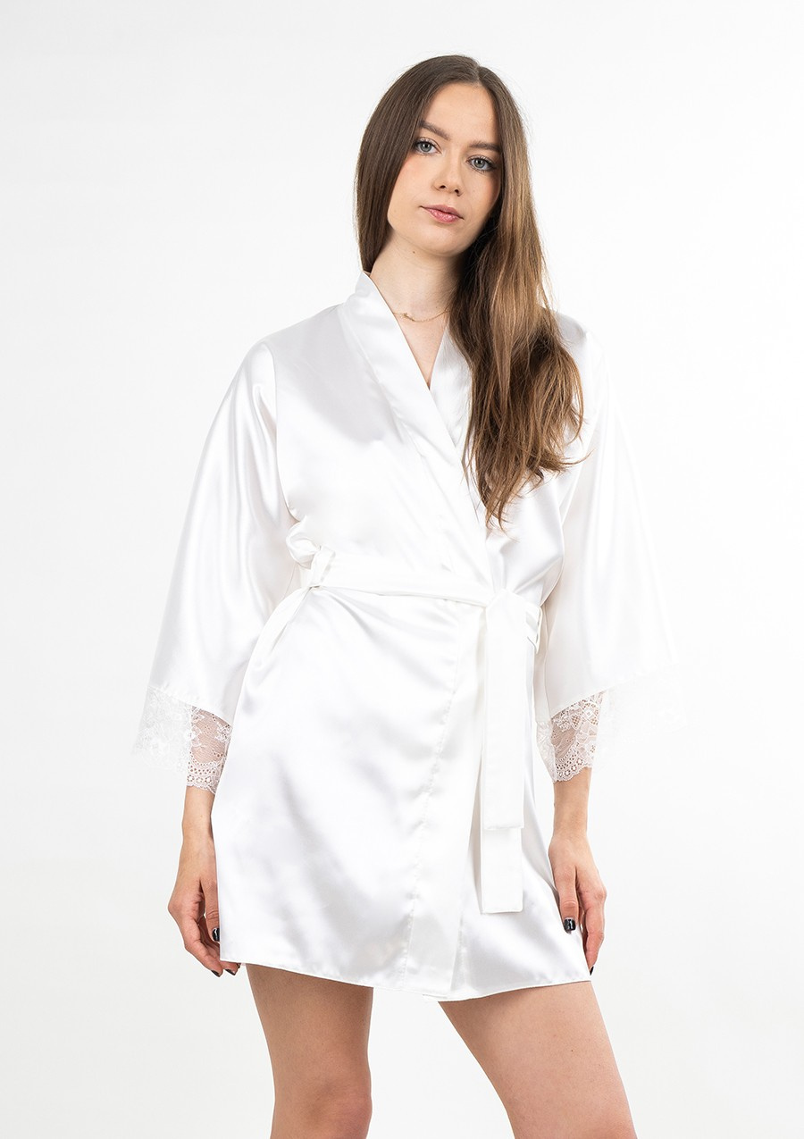 - Urokliwy szlafroczek, z koronkowym wykończeniem rękawów od Dkaren. Wyjątkowo mięciutka satyna otula ciało. Wiązany w pasie.
