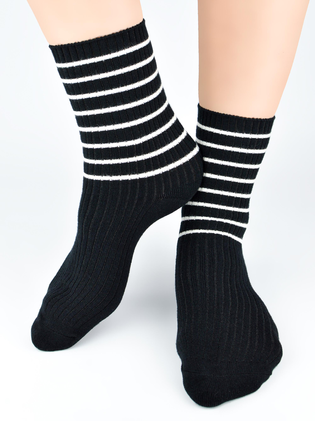 - Ciepłe akrylowe skarpety z dodatkiem wełny. Wygodne miękkie skarpetki damskie ze wzorem w kontrastowe paski, idealne na zimne dni i wieczory.