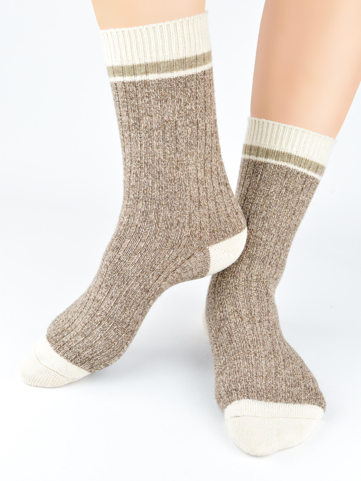- Długie, prążkowane skarpetki marki Noviti. Dzięki dodatkowi prawdziwej wełny, doskonale trzyma ciepło. Uroku dodają paseczki w ciemniejszych i jaśniejszych kolorach.
