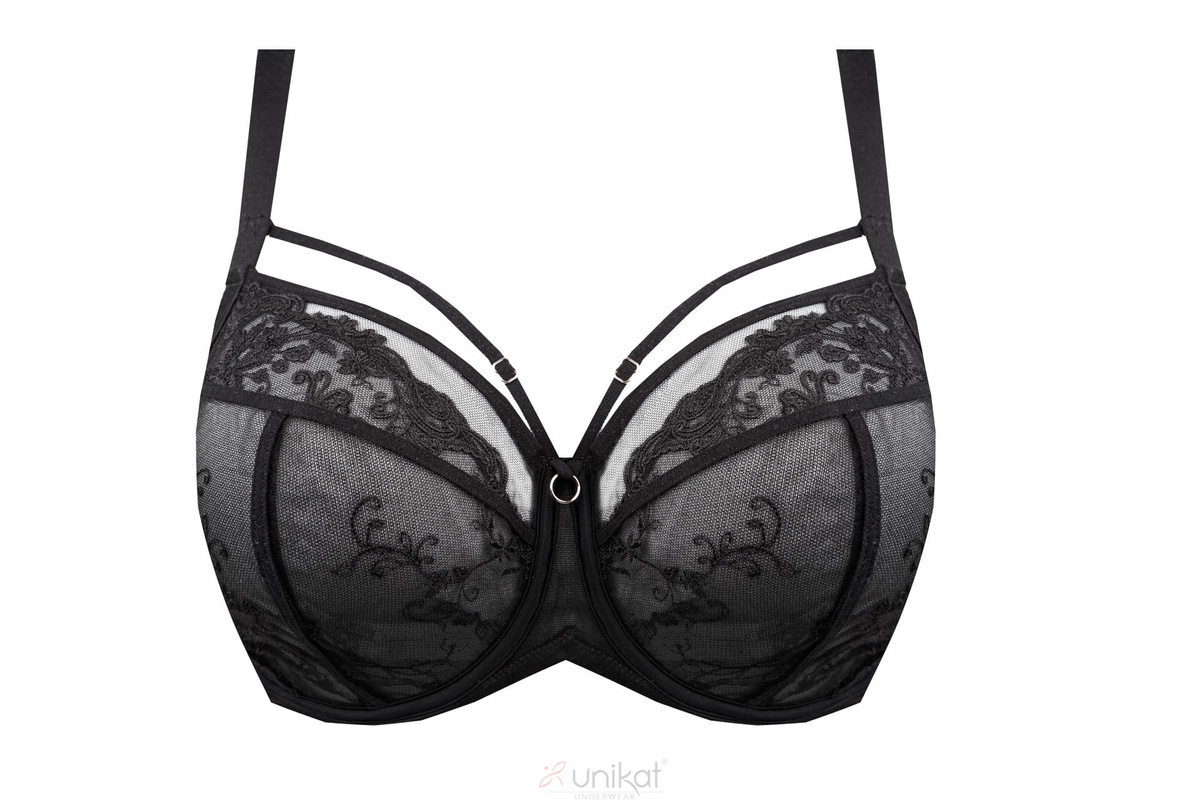 - Subtelny, miękki biustonosz od Unikat w kolorze czarnym. Niezawodnie układa się na ciele. Dodatkowym atrybutem są idealnie wszyte ozdobne paseczki.