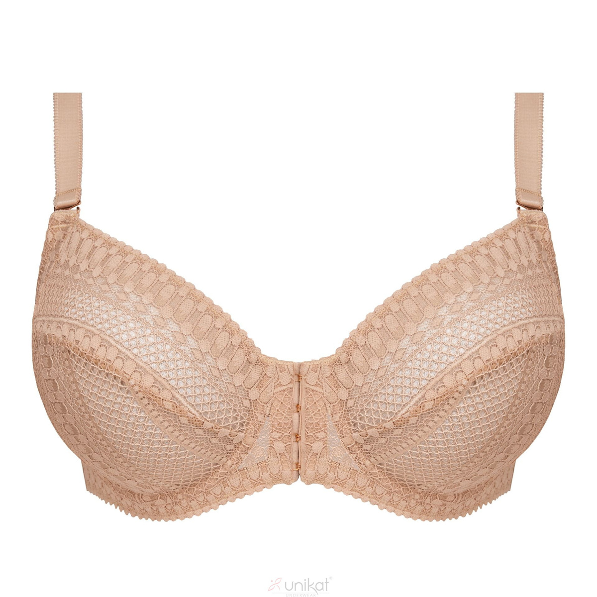 - Miękki, beżowy biustonosz Kora od Unikat. Zapinany z przodu na haftki. Idealnie zbiera piersi i nadaje im piękny okrągły kształt.