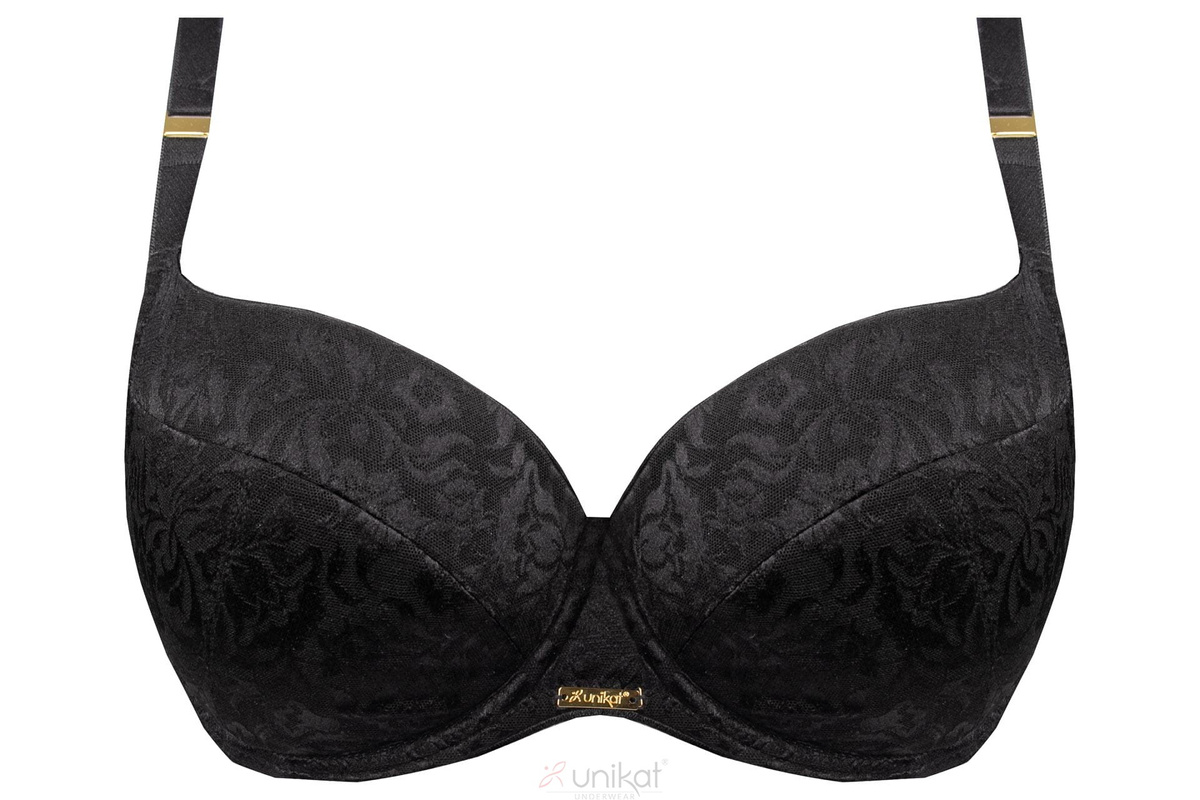 - Czarny, bardzo elegancki biustonosz z usztywnianymi miseczkami typu full cup. Pięknie podnosi i modeluje biust. Złote, subtelne dodatki podkreślają wytworność modelu.
