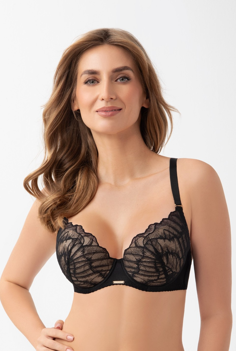 Piękny usztywniany biustonosz z elastycznej koronki, przeznaczony na małe i średnie biusty. Biustonosz z regulowanymi ramiączkami, w dwóch szerokościach. Odpinane ramiączka umożliwiają przepięcie na kilka sposobów, np do sukienki z odkrytymi plecami. Biustonosz unosi i zbiera biust do środka, fiszbiny boczne zapobiegają zwijaniu się materiału . Haftki w zależności od rozmiaru dwu lub trzyrzędowe z trójstopniową regulacją.