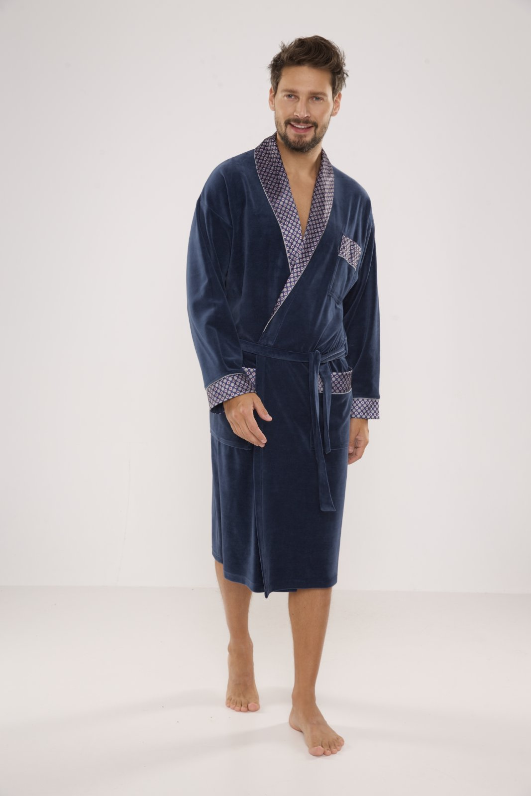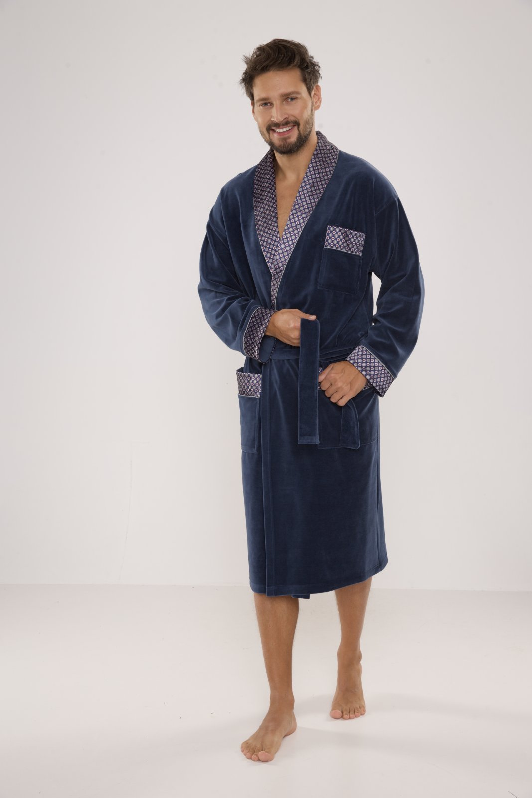 - Bawełniany szlafrok męski De Lafense 868. Długi, z szalowym kołnierzem, wiązany na pasek, z dwoma naszytymi kieszeniami i jedną mniejszą na wysokości klatki piersiowej. Mankiety, kołnierz i kieszenie wykończone wzorzystą satyną. Bardzo wygodny i elegancki