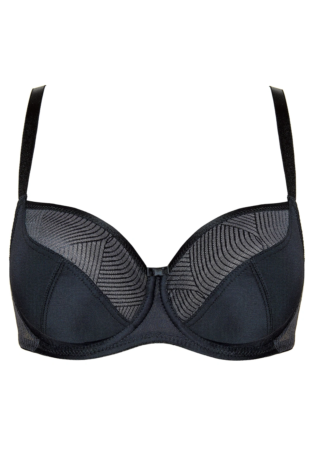 - Czarny biustonosz typu soft od Gorteks z geometrycznym wzorem. Uszyty z 3 częściowych miseczek. Szerokość ramiączek jest zależna od rozmiaru biustonosza.